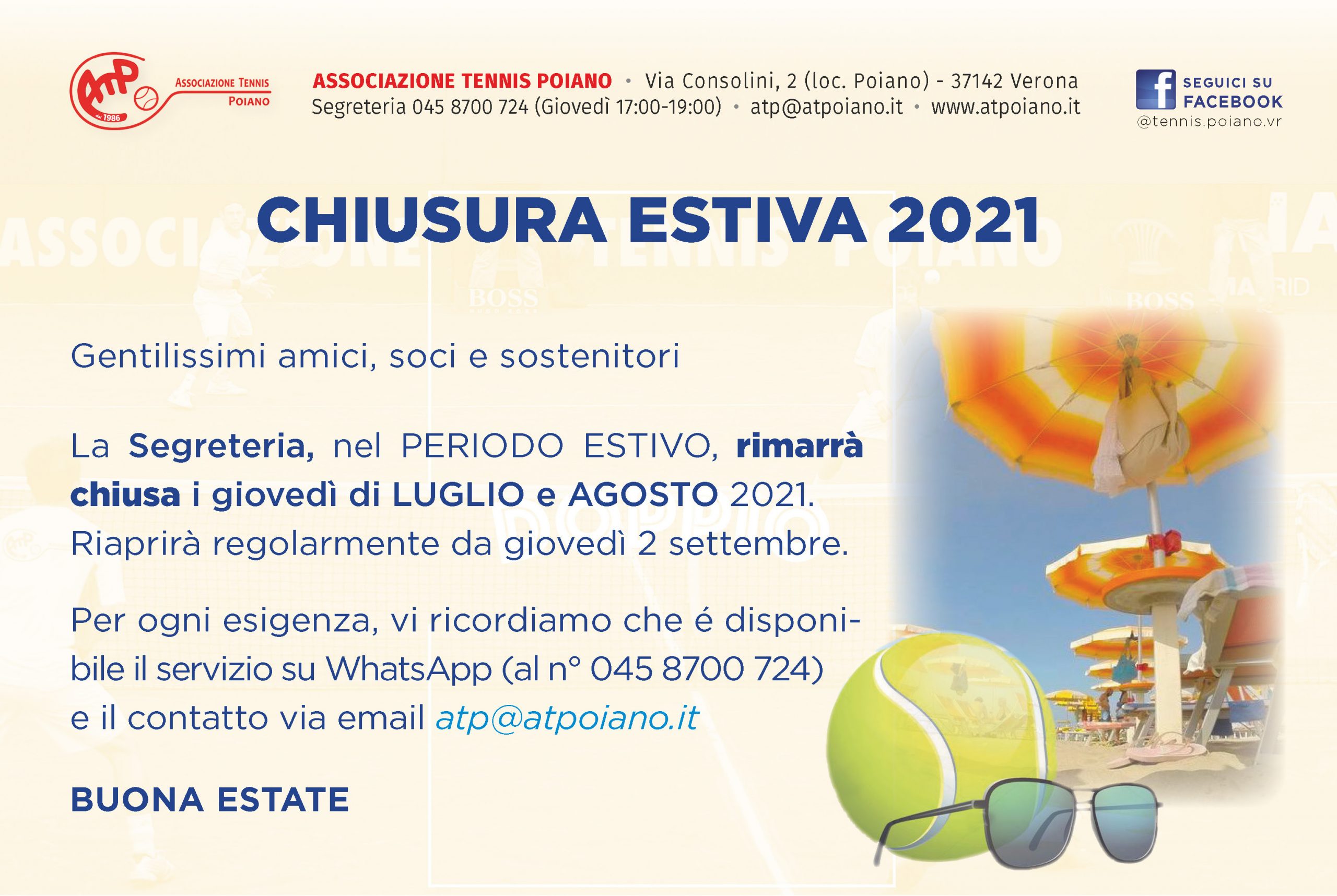 La Segreteria, per il PERIODO ESTIVO, rimarrà chiusa i giovedì di LUGLIO e AGOSTO 2021.